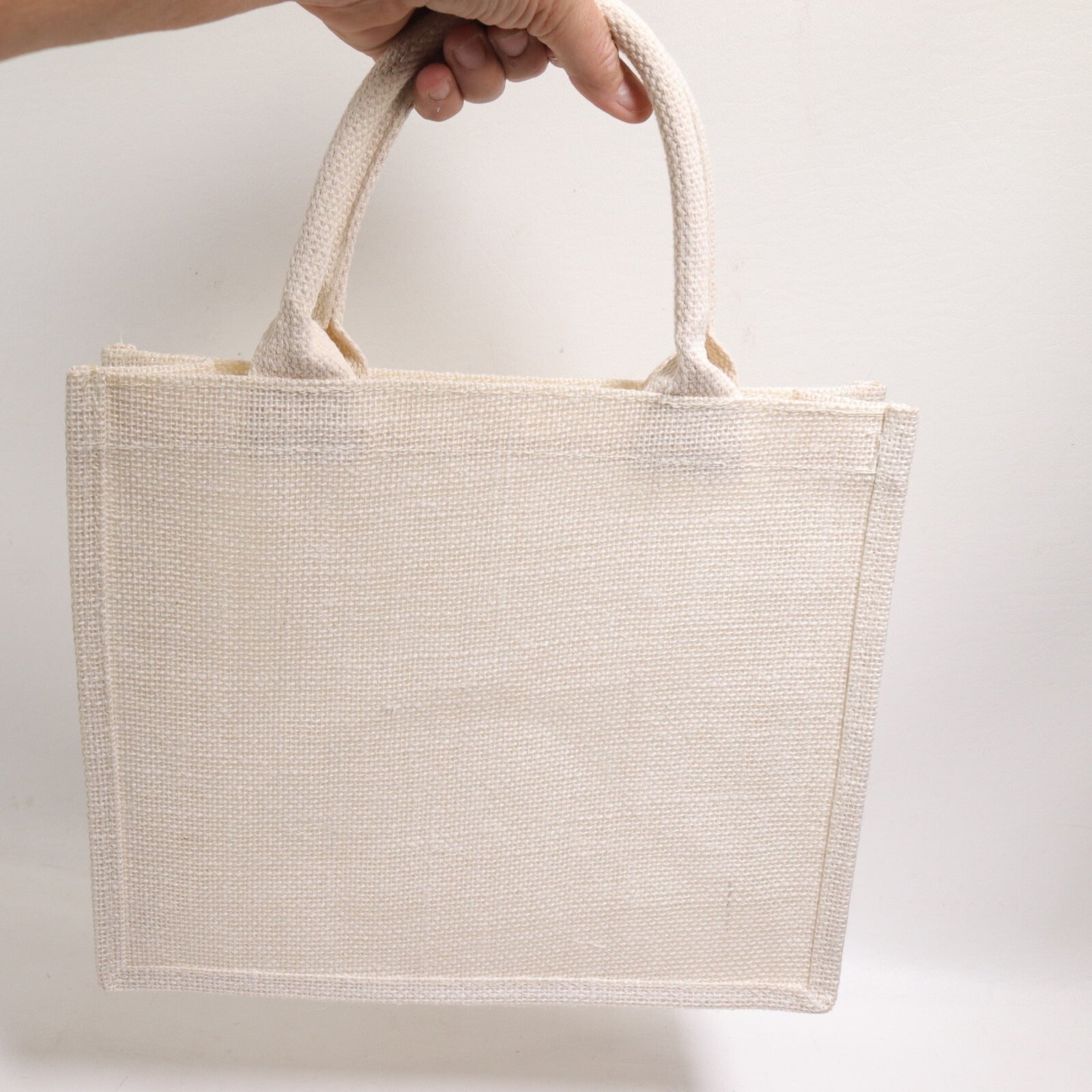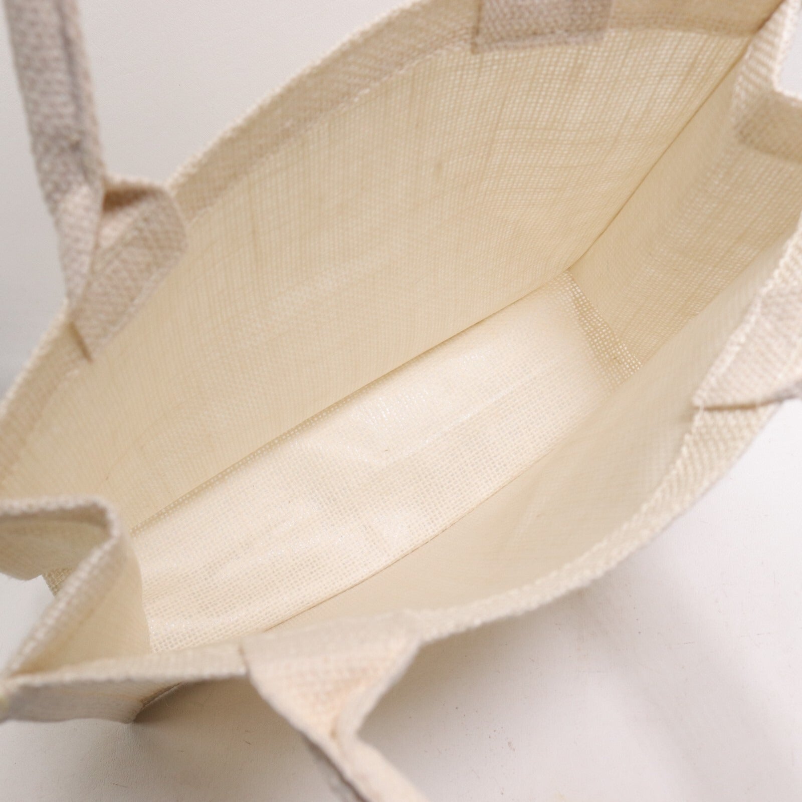 Jute Burlap Tote Bag Small Ivory Covered Handles Laminated LIning 12X10